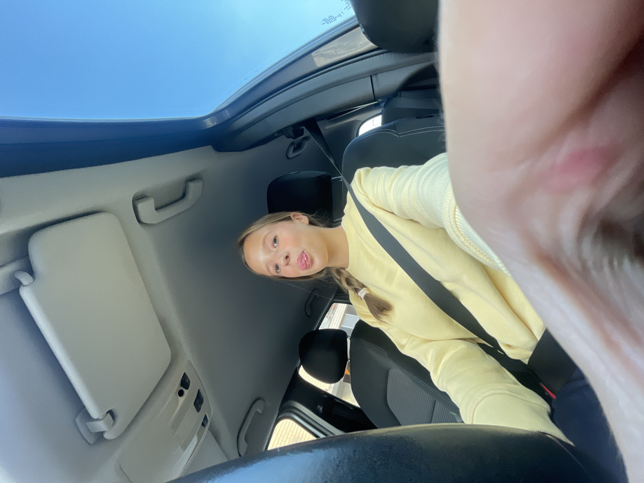 young female seated in the driver's position of a vehicle, in Matosinhos, Portugal, during what appears to be daylight. She is wearing a light yellow long-sleeved sweatshirt and a black seatbelt fastened across her chest. Her hair, light brown, is styled in a single braid over her left shoulder, secured with a light-colored band. She is looking directly at the camera with her tongue extended. The interior of the vehicle features a light-colored headliner, a raised sun visor on the driver's side, and an overhead console with various controls and a compartment. A grab handle is visible above the front passenger seat. The steering wheel is partially visible on the left side of the frame. Through the passenger-side window, a clear blue sky is visible, suggesting fair weather. A blurred human hand or fingers, exhibiting a reddish discoloration, occupies the lower right foreground, partially obscuring the subject's leg. Through the driver's side window, a faint architectural structure is discernible.
