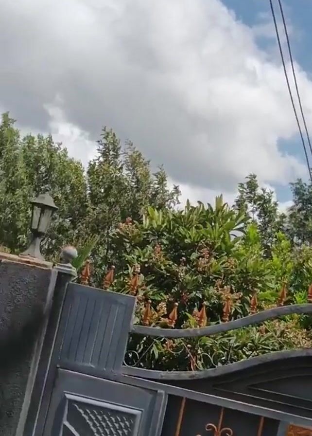 The camera pans upward, starting from a gray and brown gate, towards a view of green trees, a partly cloudy sky with a small patch of blue, and a brick and gray pillar topped with a black lantern. The scene appears to be outdoors, potentially in a residential area. Electrical wires are visible against the sky.