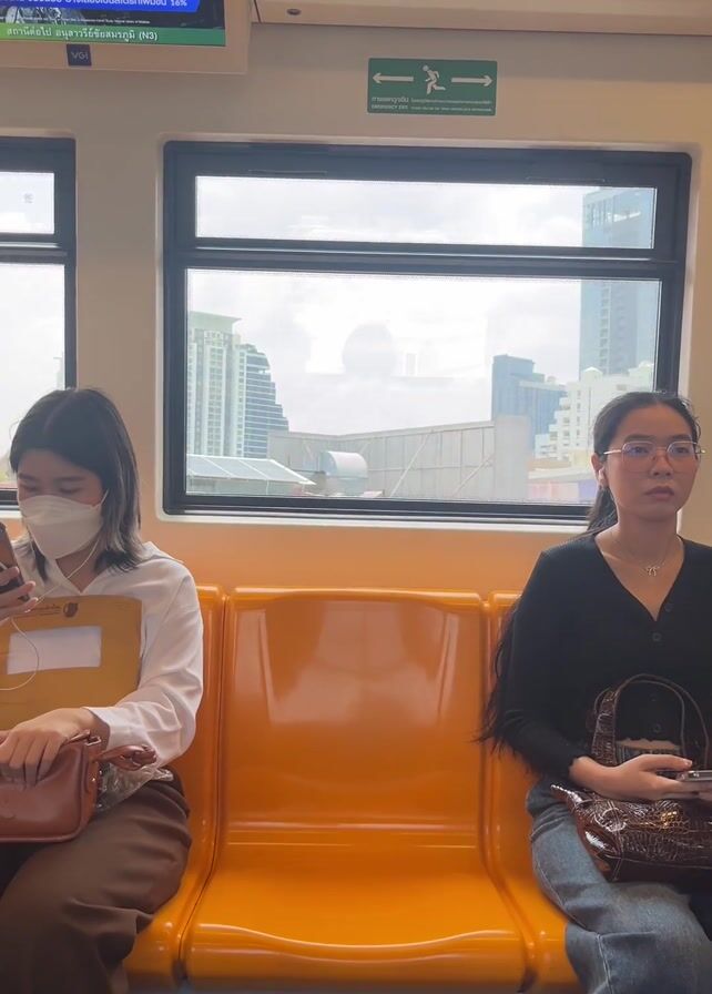Two young women are sitting on an orange bench inside what appears to be a train. The woman on the left wears a white shirt, brown pants, a face mask, and a light brown purse. She holds a phone and a yellow folder. The woman on the right wears glasses, a black sweater, and jeans, and she holds a brown purse with a textured pattern. Outside the window behind them is a view of a city with tall buildings. Above the women are screens displaying medical images and advertising in Thai. The train is moving, judging from the changing view outside the window.