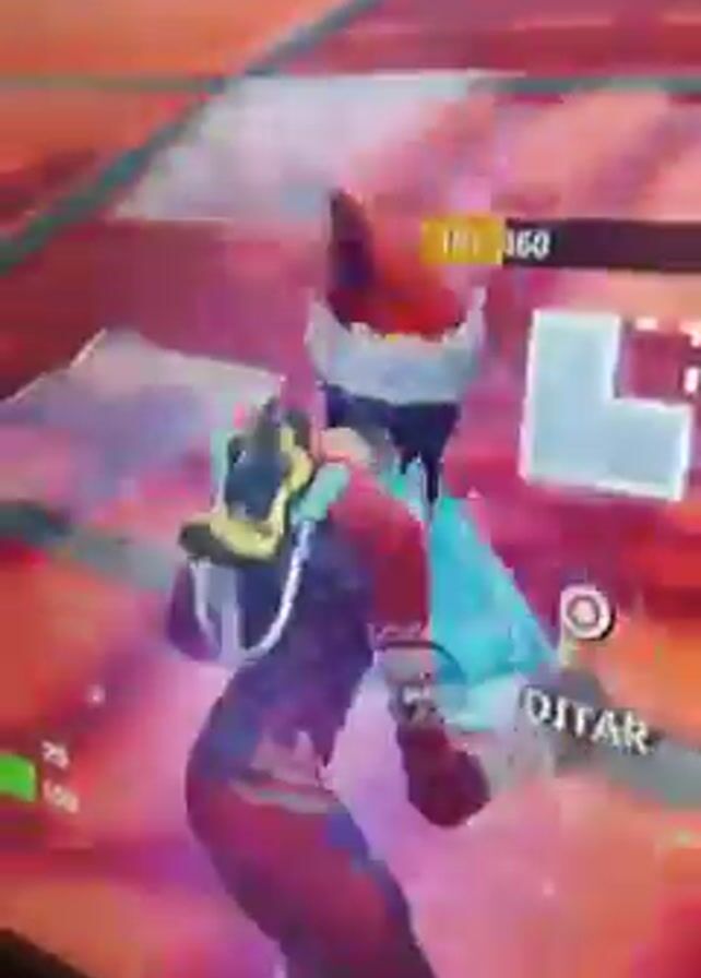 third-person perspective of a character in a video game, likely Fortnite, wearing a Christmas-themed outfit including a Santa hat and a red sweater with a white snowflake pattern. The character is navigating a virtual environment with rapidly changing colors and textures, and the player is editing structures within the game. At one point the character picks up a weapon.