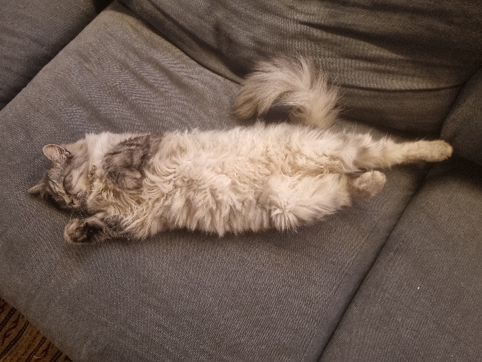 - "A long-haired domestic cat, exhibiting silver tabby markings on its head, back, and tail, with a cream-white belly and chest, lies supine on a grey upholstered sofa" by FM-YTYDR2, licensed under CC BY 4.0