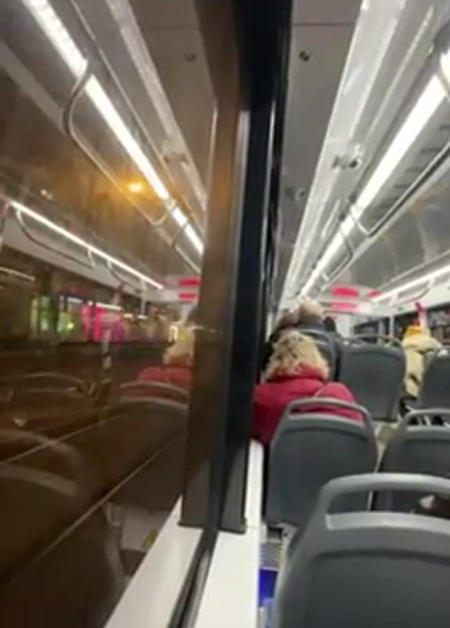interior of a bus or tram, viewed from a seat. People are seated along the side, facing forward. The window shows a blurred view of streetlights and buildings at night. The interior is brightly lit with long fluorescent lights on the ceiling.