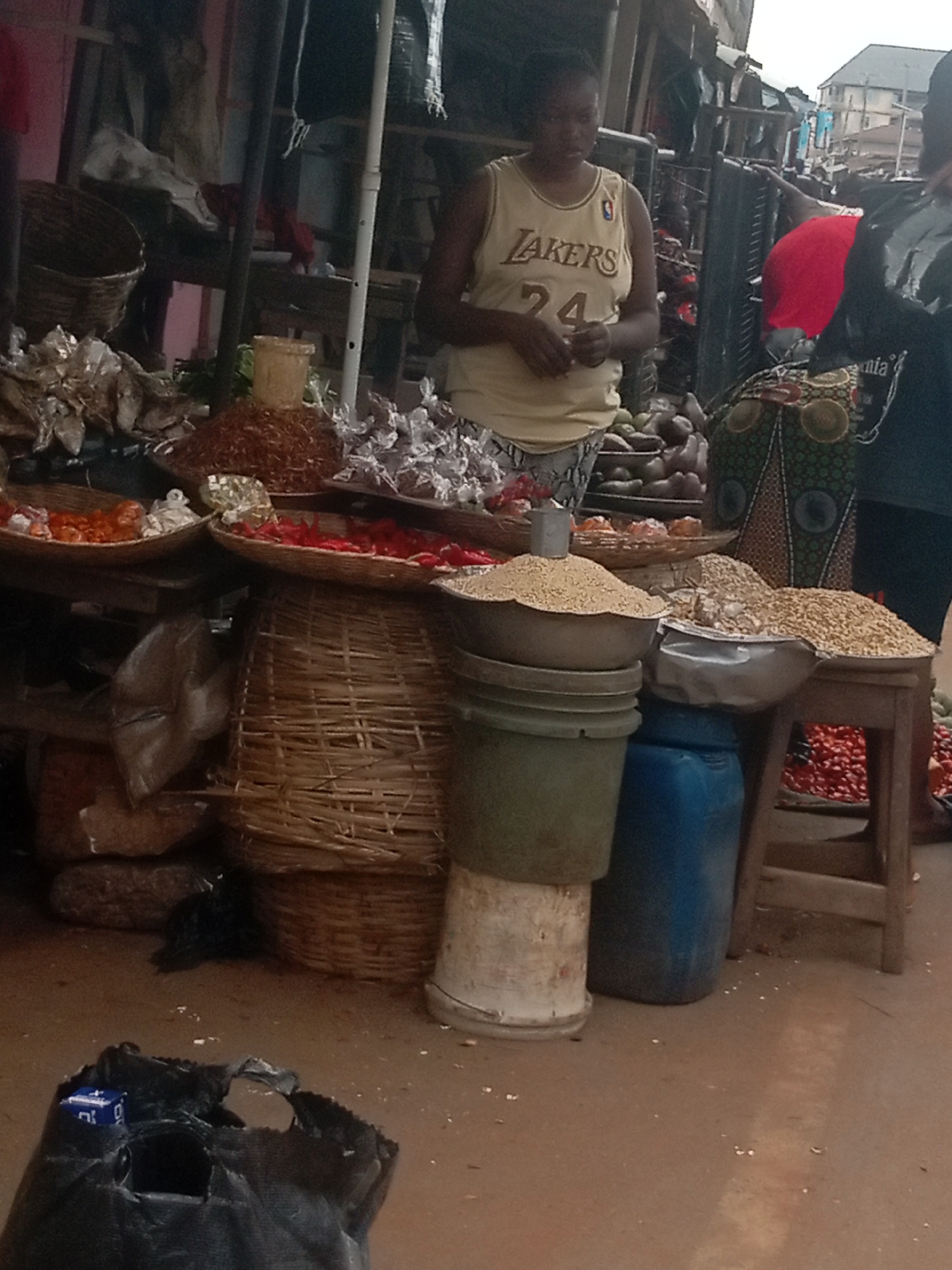 The image depicts a scene at a market in Nkpor, Nigeria. A woman wearing a Lakers jersey stands behind a stall laden with various goods. These include grains in metal bowls and plastic buckets, as well as spices and other food items displayed in baskets. A woven basket is also visible on the stall. Another person, partially obscured, stands to the right wearing a patterned skirt and a black shirt. A black bag with a small object inside sits on the ground in the foreground. The market appears to be crowded and bustling.