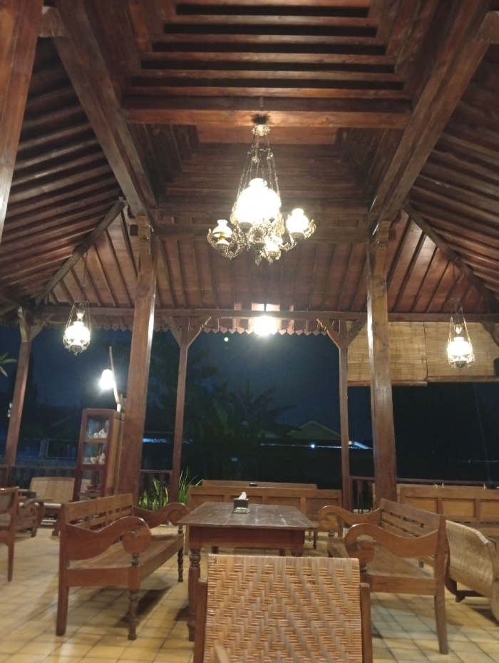 - "The image depicts an interior view of an open-sided, traditionally-styled wooden pavilion, likely a restaurant or lounge area, at night in Margorejo, Indonesia" by FM-4sN6B3, licensed under CC BY 4.0