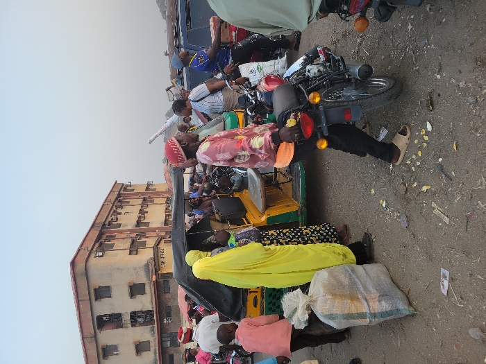 A vibrant street scene shows a crowded space with a building in the background. A three-wheeled vehicle is packed with passengers, and a motorcycle sits nearby. People wearing colorful clothing surround the vehicles. Bags and goods are on the ground, adding to the bustling atmosphere. The scene reflects a busy and active urban setting.