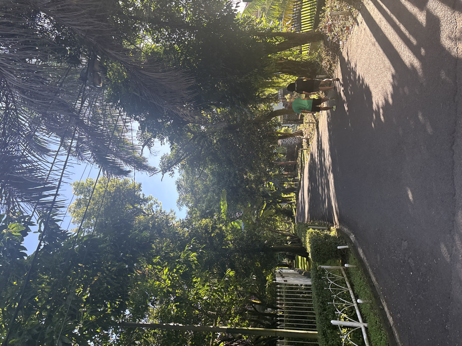 A sunlit road winds through dense tropical foliage, casting long shadows. Two figures walk along the asphalt. Lush greenery overhangs the path, a canopy of leaves filtering the light. A white metal fence borders one side of the road, partially obscured by manicured shrubs. Palm fronds extend across the top left of the frame, adding to the jungle-like atmosphere.
