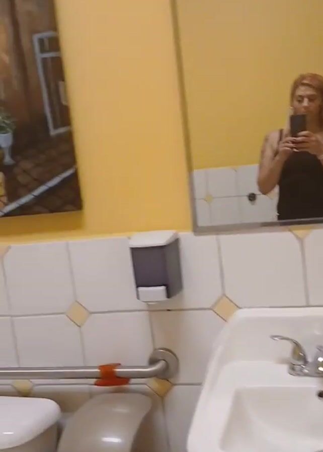 restroom interior. The walls are painted yellow with a white tile border featuring yellow diamond accents. The restroom includes a white porcelain sink with chrome fixtures, a toilet with a gray soap dispenser mounted above, and metal grab bars alongside the toilet. Two framed paintings adorn the walls: one depicting a European-style street scene with a cafe, and the other featuring an image of three orange flowers. A black tissue dispenser is mounted on the wall above the tile border. The reflection of a woman is visible in a mirror above the sink. She is holding a smartphone, possibly taking the video.