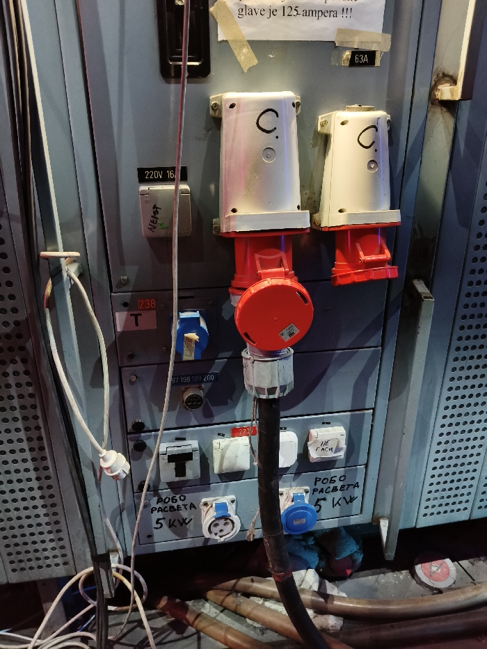 The image displays a close-up, vertically oriented view of a gray metal electrical distribution panel or cabinet. No individuals are present in the scene. Affixed to the upper section of the panel is a white paper notice, secured by two pieces of tape, with partially visible text reading "glave je 125 ampera!!!". A small black label marked "63A" is positioned below this notice. Two white industrial power receptacles with red bases are mounted centrally; the left receptacle is covered with a red cap, while the right is open. Both bear a black "C." marking. To the left of these, a gray rectangular electrical component is labeled "220V 16A" and "NEISP." Below this, a white electrical cord with a European Type F plug is suspended by a white hook. The mid-section features a blue industrial socket, partially obscured by light-colored tape. Below this, a circular multi-pin connector is present, with the number "97 198 199 200" printed above it. A thick black electrical cable enters the panel through a white strain relief fitting and connects to a red industrial plug, which is inserted into an unseen receptacle. The lower portion of the panel contains a horizontal row of four white rocker switches or circuit breakers. The two on the left are marked "POBO РАСВЕТА 5 KW" (Auxiliary Lighting 5 KW). One on the right is marked "НЕ ГАСИ" (Do Not Turn Off). Below these, two smaller industrial sockets are mounted: a white one to the left and a blue one to the right, which has a small sticker. Additional handwritten text "POBO РАСВЕТА 5 KW" is visible to the left of these sockets. The base of the panel sits above a dark floor where multiple dark, flexible conduits, hoses, or cables are present, along with a red circular cap and scattered scraps of blue and white fabric. Perforated metal panels, suggesting ventilation or part of a larger enclosure, are visible along the far left and right edges of the frame. The image provides no discernible details to identify its precise location within the Cukarica Urban Municipality, Serbia.