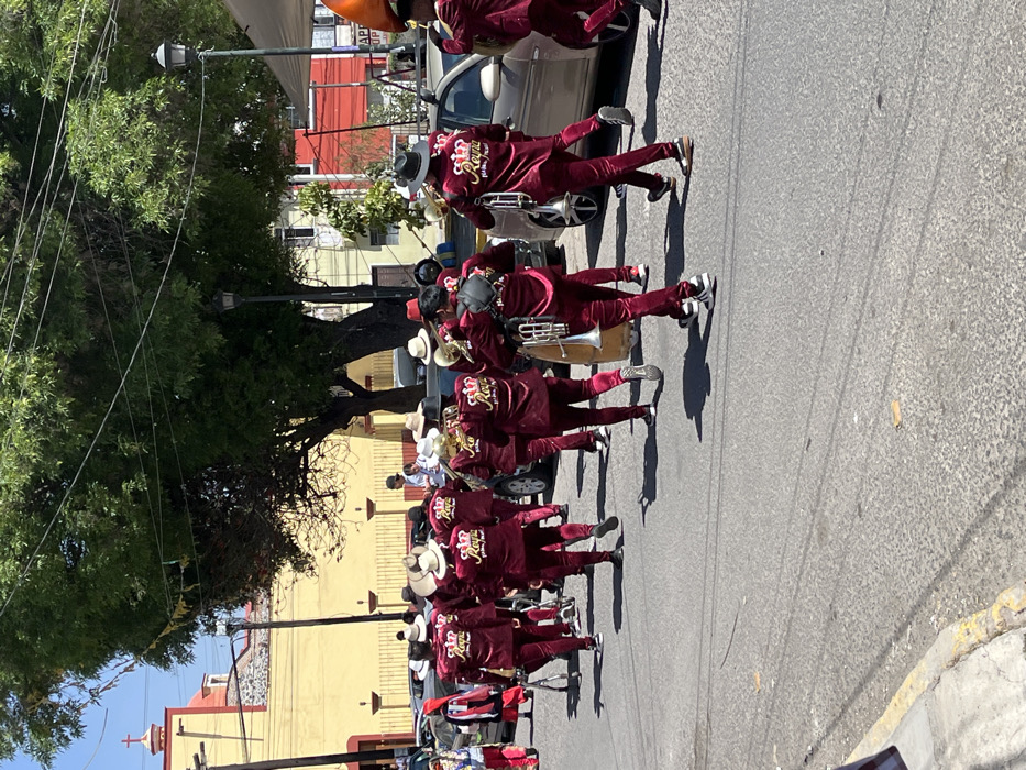 A marching band parades down a street. The band members wear matching burgundy suits and some wear straw hats. They play brass instruments, including trumpets and trombones. Buildings line the street, painted in yellow, white, and red. Cars are parked along the road. A large tree with lush green foliage provides shade. The scene appears to be captured on a sunny day.