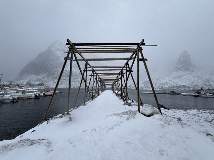 The scene depicts a snow-covered harbor area in Reine, Norway, under an overcast sky. A prominent, empty wooden structure, identified as a stockfish drying rack, extends centrally from the foreground into the midground, its wooden beams bare. A snow-covered path lies directly beneath the structure. To the left, a marina contains multiple moored white motorboats and several snow-dusted buildings, with a large, rugged, snow-covered mountain rising sharply in the background, partially obscured by haze. To the right, a calmer section of water features a pier with larger vessels and a distinct, sharply pointed, snow-covered mountain peak in the distance, also partly veiled by atmospheric conditions. The ground, path, and visible mountain ranges are thoroughly covered in snow, indicating winter conditions. The sky is uniformly gray and overcast. No individuals are present in the scene, and no specific actions or interactions are depicted.