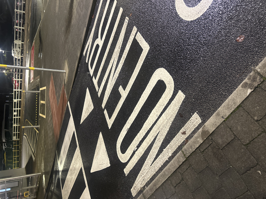 A wet, dark asphalt road displays the words "NO ENTRY" in bold white letters. The perspective is slightly angled, highlighting the road surface's texture. A triangular arrow accompanies the lettering, suggesting restricted access. To the left, a metallic barrier and indistinct infrastructure elements hint at a controlled entrance or exit point. The scene is illuminated by artificial light, casting reflections on the wet surface. A strip of paved stone separates the asphalt from an adjacent structure.