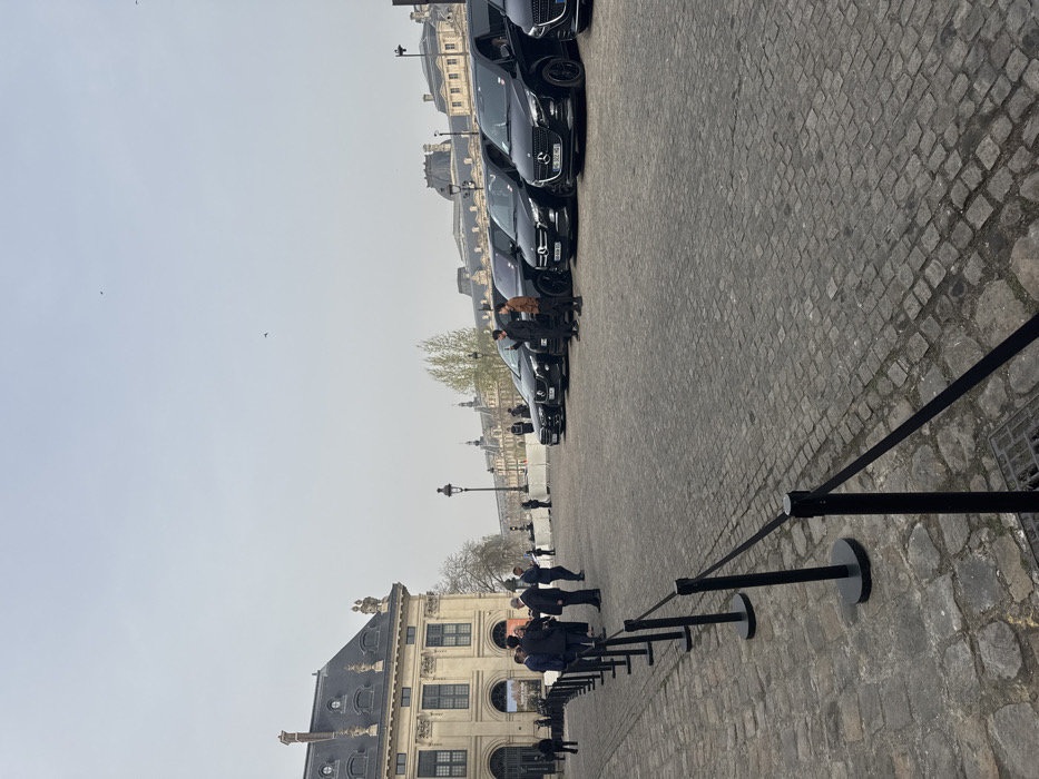 The scene depicts a wide cobblestone courtyard in Paris, France, within the Louvre Palace complex, facing towards one of its wings and potentially the Cour Carrée area. In the foreground, a black stanchion system with retractable belts forms a diagonal barrier across the uneven grey cobblestone paving. To the left, a group of approximately 10-15 individuals, primarily men in dark suits, are gathered and conversing near the entrance of a grand, light-colored stone building with multiple arched windows and a grey mansard roof, characteristic of the Louvre's architecture. Further down this building, several people are observed standing. To the right, a line of seven black luxury vehicles is parked. Six are identified as black Mercedes-Benz vans (likely V-Class models) and one is a black Mercedes-Benz sedan. French license plates are visible on some vehicles (e.g., "HH-636-GS," "HH-322-MG"). Two individuals stand near the parked vehicles; one, wearing a brown jacket, is looking at a phone, while the other, in a dark jacket, stands nearby. In the mid-background, a black streetlamp stands. Bare trees are visible between the architectural structures. The background features a long, lower classical building with a dark, ornate mansard roofline and numerous dormer windows, consistent with another wing of the Louvre Palace. The sky is uniformly light grey and overcast. Two small birds are visible in flight in the upper sky.