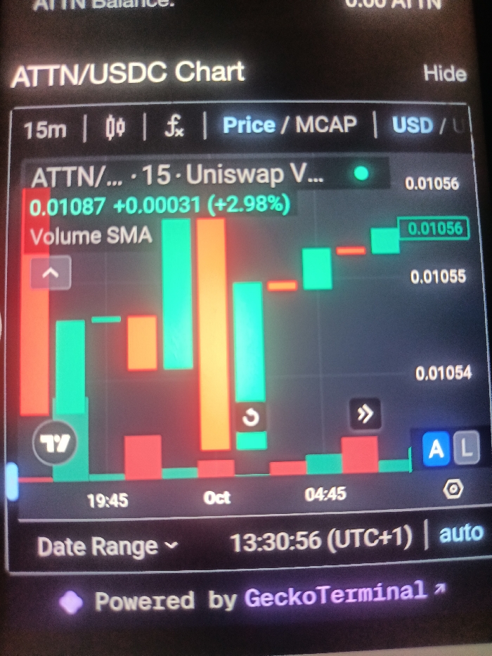The image displays a slightly angled, handheld photograph of a digital screen featuring a cryptocurrency trading chart. The screen's interface has a dark background. The chart title, "ATTN/USDC Chart," is visible at the top. Below this, various timeframes and display options like "15m," "Price / MCAP," and "USD" are presented. The current price of ATTN is displayed as "0.01087," with a green indicator showing a gain of "+0.00031 (+2.98%)." The main chart area consists of vertical bars/candlesticks in shades of green (teal), red, and orange/yellow, representing price and volume fluctuations. Horizontal lines on the right axis denote price levels, such as "0.01056" (highlighted in a green box), "0.01055," and "0.01054." The bottom axis shows time markers including "19:45," "Oct," and "04:45." A "Date Range" selector and the current time "13:30:56 (UTC+1)" are visible towards the bottom. The chart is explicitly stated to be "Powered by GeckoTerminal." There are no people, physical objects, or environmental details visible in the image beyond the digital screen, preventing the determination of a physical capture location within Unguwar Kaya, Nigeria, or any other city.