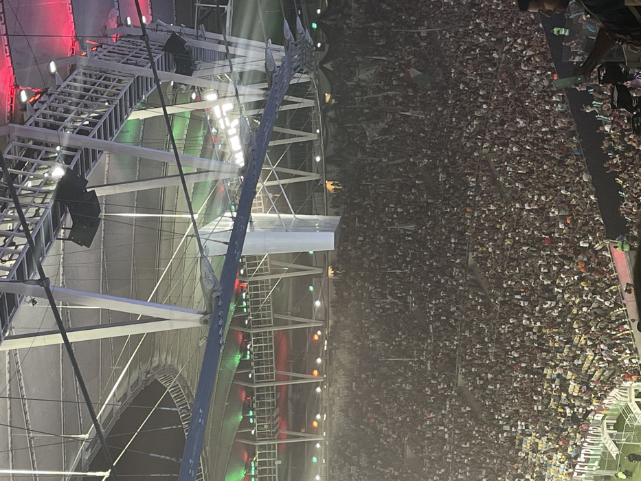 A densely packed crowd fills a stadium. Overhead, a complex network of metal scaffolding supports lighting rigs and sound equipment. Red and green lights accent the structure. A support beam is visible in the foreground. The crowd appears to be watching a performance or sporting event.