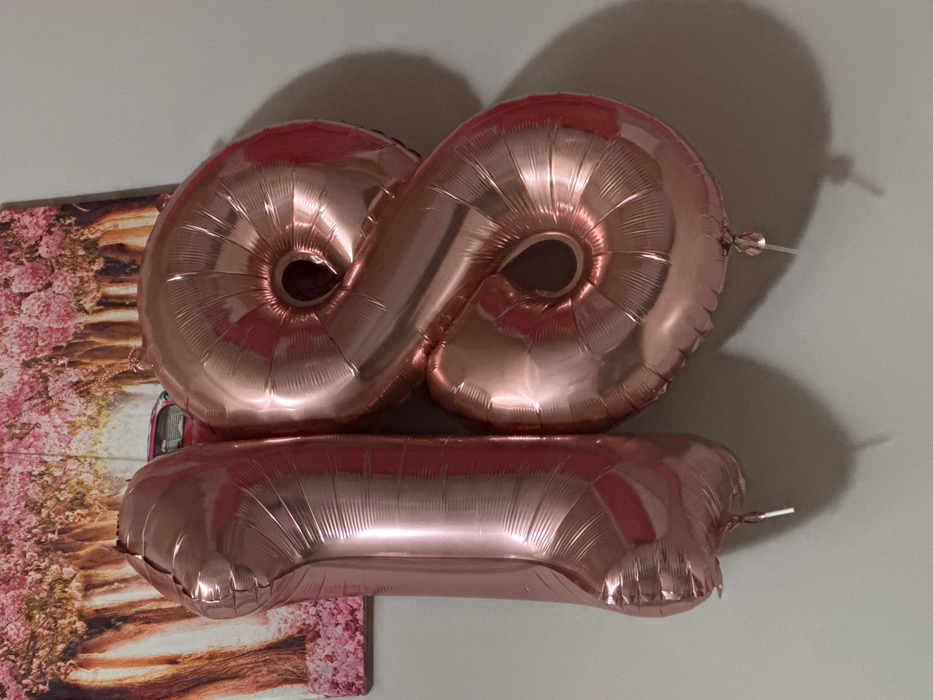 The scene depicts two inflated foil balloons, colored rose gold, forming the number "18"