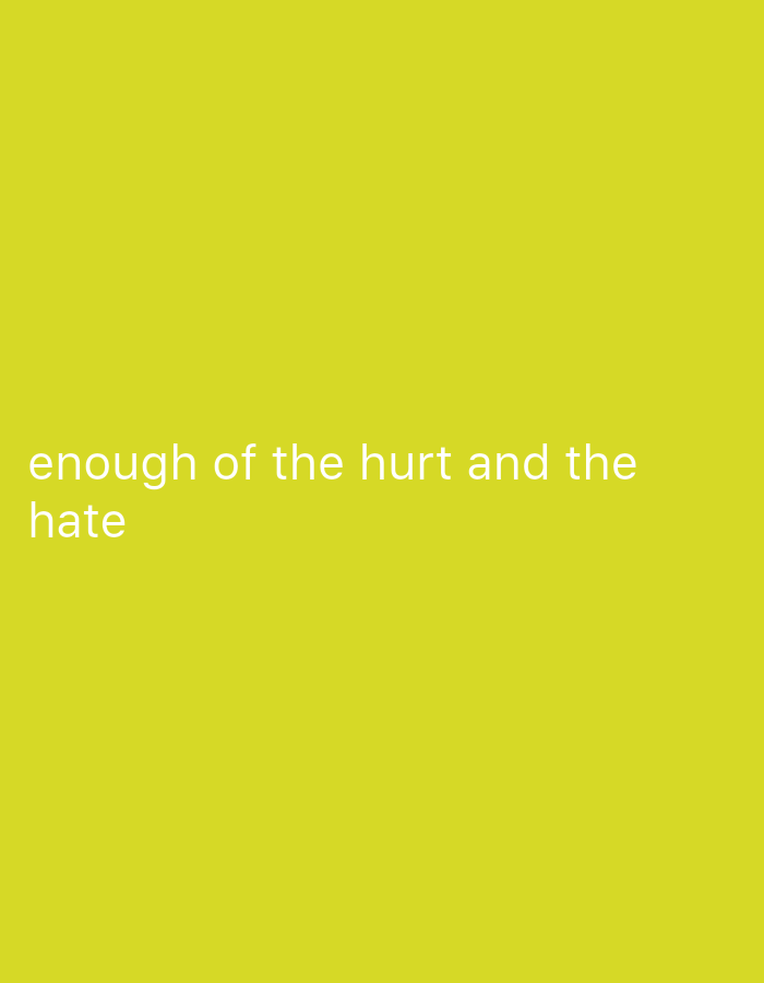 The image displays a digital graphic, intended for observation in Unguwan Rimi, Nigeria. The entire frame is filled with a solid, uniform chartreuse color (bright yellow-green). Positioned in the lower-left quadrant, white sans-serif text is present. The text is arranged on two lines: "enough of the hurt and the" followed by "hate" directly below it. No people, animate subjects, physical objects apart from the text, actions, or interpersonal interactions are depicted within this digital graphic. The environment is entirely a monochromatic color field.