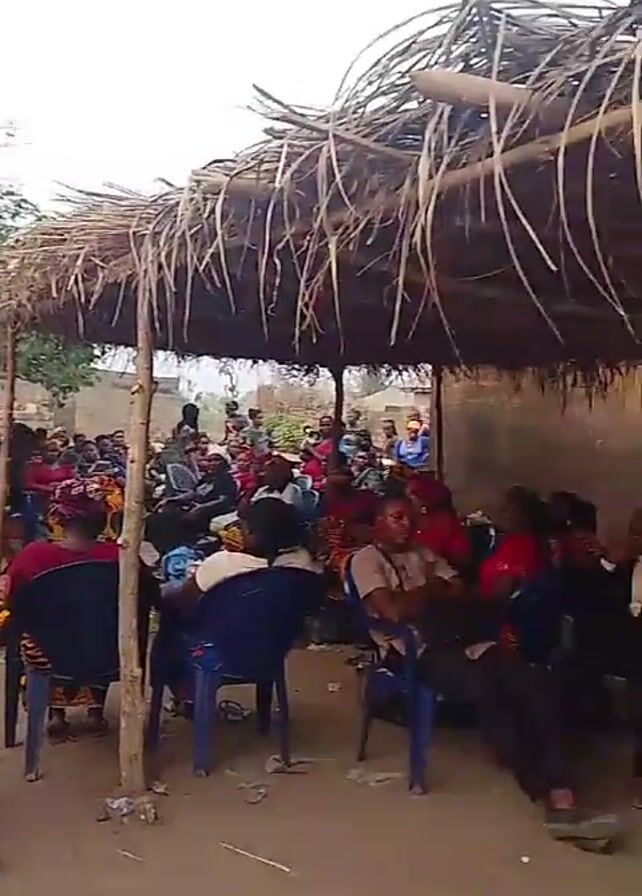 group of people seated in chairs outdoors under a thatched roof structure. A woman in a red shirt and colorful skirt stands and gestures in front of them. The people appear to be attending an event or gathering in what seems to be a rural setting. The video pans across the seated individuals, revealing a mix of men and women dressed in a variety of casual and formal attire. Some are talking to each other, while others are listening to the woman standing. The backdrop includes trees and a simple building.