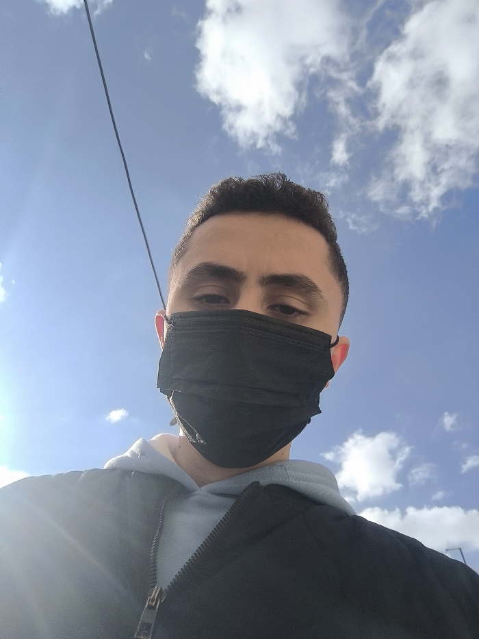 An upward-angled photograph depicts an individual, likely male, from the upper chest to the top of the head, set against a bright blue sky with scattered white cumulus clouds. The individual wears a black disposable face mask, a light blue hooded sweatshirt, and a dark, possibly black, zippered jacket. Dark, short, curly hair is visible above the forehead, and dark eyebrows frame the eyes, which are directed forward. Sunlight causes a lens flare in the lower-left quadrant of the image. A thin, dark wire or cable traverses the upper portion of the frame diagonally from upper left to mid-right. The scene is outdoors in the city of Jirud, Syria.