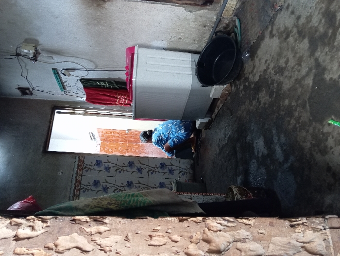 A person in a blue shirt is kneeling in a room with tiled walls. A washing machine stands beside a black bucket. Clothes hang nearby. The floor appears wet and dirty. Electrical wiring is visible on the ceiling. The foreground shows what appears to be a textured, concrete surface. The overall impression is of a simple, functional, and somewhat unclean space.
