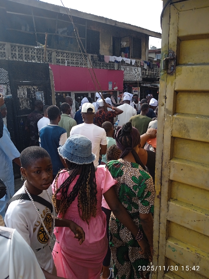 An outdoor scene in Akowonjo, Nigeria, depicts a dense crowd of individuals gathered on what appears to be a street or narrow passage