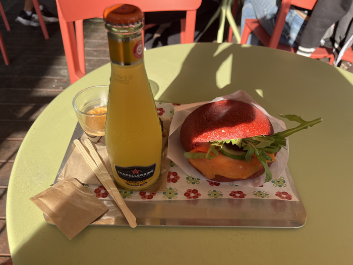 The image displays a meal served outdoors on a light green table in Petah Tikva, Israel. A rectangular metal tray holds the items. On the tray, a red-bun sandwich, containing an orange patty, sliced cucumber, and arugula, is partially wrapped in white paper and sits on a floral-patterned paper liner. Adjacent to the sandwich is a yellow glass bottle of San Pellegrino Aranciata. A small clear glass cup contains an orange-yellow sauce or dip. Two small wooden utensils and a sealed brown paper packet are also present on the tray. Strong sunlight illuminates the scene, creating distinct shadows on the table and objects. In the blurred background, red outdoor chairs and portions of individuals, including legs and shoes, are visible.
