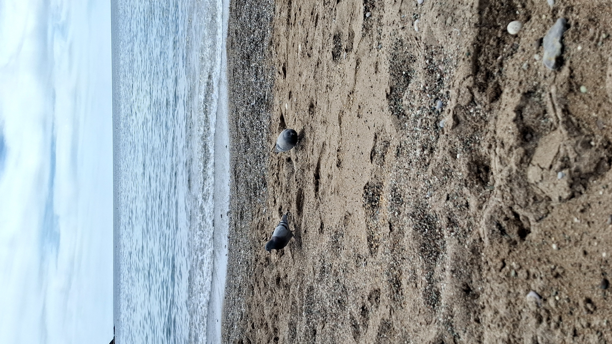 The image depicts a beach in Boreti, Montenegro. Two pigeons are present on the sandy shore near the water's edge. The sand varies in texture, with finer grains closer to the water and coarser, pebbly areas further inland. A footprint is visible on the drier sand. The sea is calm with small waves breaking on the shore. The sky is cloudy.