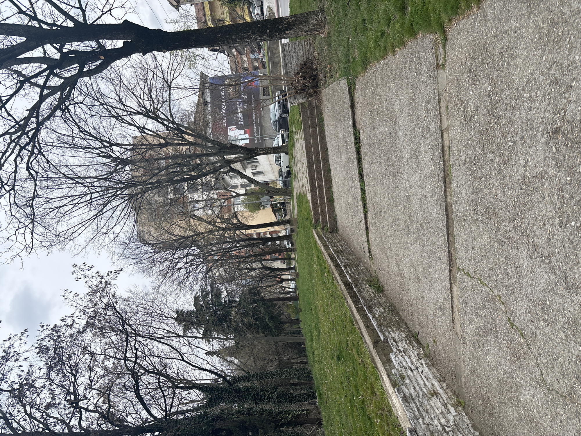 The image displays an urban park setting in Petrich, Bulgaria, captured on an overcast day. A concrete pedestrian pathway, showing minor cracking and some grass growth in fissures, extends from the foreground and ascends via multiple steps towards the background. To the left of the path, a low retaining wall constructed from irregular, light-colored stones separates the concrete from a verdant, upward-sloping grassy area. To the right, a grassy verge borders the path. No individuals are present in the scene. In the midground, numerous deciduous trees with bare branches dominate, suggesting late winter or early spring conditions. A cluster of evergreen trees is visible to the left among the deciduous ones. Further up and to the right of the path, a small stone planter or wall section contains a leafless shrub. Beyond the trees, several vehicles are parked parallel, including a white sedan and a dark-colored modern sedan. The background features multiple multi-story buildings characteristic of urban architecture. A large advertisement or mural on one building displays Cyrillic text and an image of a man, explicitly referencing "K & B Petrich," which confirms the city. The sky is uniformly overcast with light gray cloud cover.