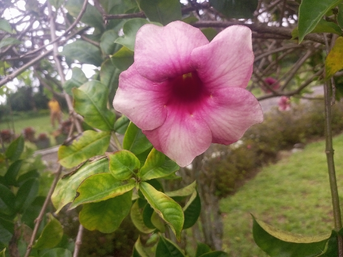 The image depicts an outdoor botanical scene in Ciherang, Indonesia. The primary subject is a single, five-petaled, funnel-shaped flower positioned slightly right of center in the foreground, displaying a light pink exterior with a deep magenta interior throat. The flower is attached to a plant featuring green leaves, some exhibiting variegated or discolored yellow-green patches, and surrounded by thin, brown, interweaving stems. The background is blurred, showing additional pink flowers similar to the primary subject, green foliage, trees, and an expanse of green grass. A dark, curvilinear path or road is visible in the right mid-ground, adjacent to the grassy area. A faint, light-colored structural element is partially discernible behind plants in the mid-ground. One highly blurred, yellowish human figure is observed standing upright in the far background on the left side, largely obscured by vegetation. No discernible actions or interactions are evident for the figure.