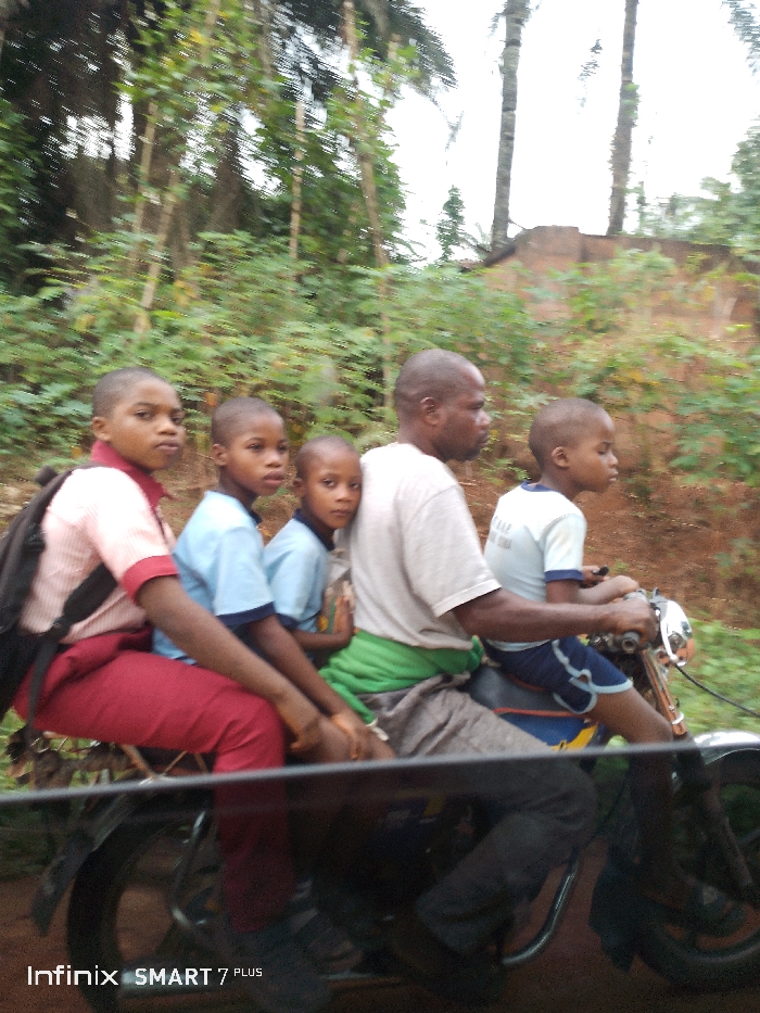 - "A man drives a motorcycle with four children riding with him, likely on their way to or from school" by FM-Knnms1, licensed under CC BY 4.0