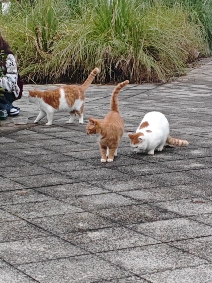 - "The scene, set on a grey tiled pathway in Chongqing High-tech Zone, China, features four domestic cats and a partially visible human figure" by FM-DpvWU2, licensed under CC BY 4.0