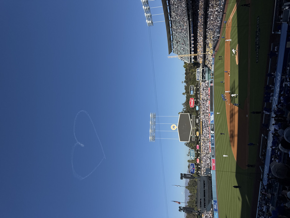 This image depicts an outdoor baseball stadium scene at Dodger Stadium in Los Angeles, California, United States