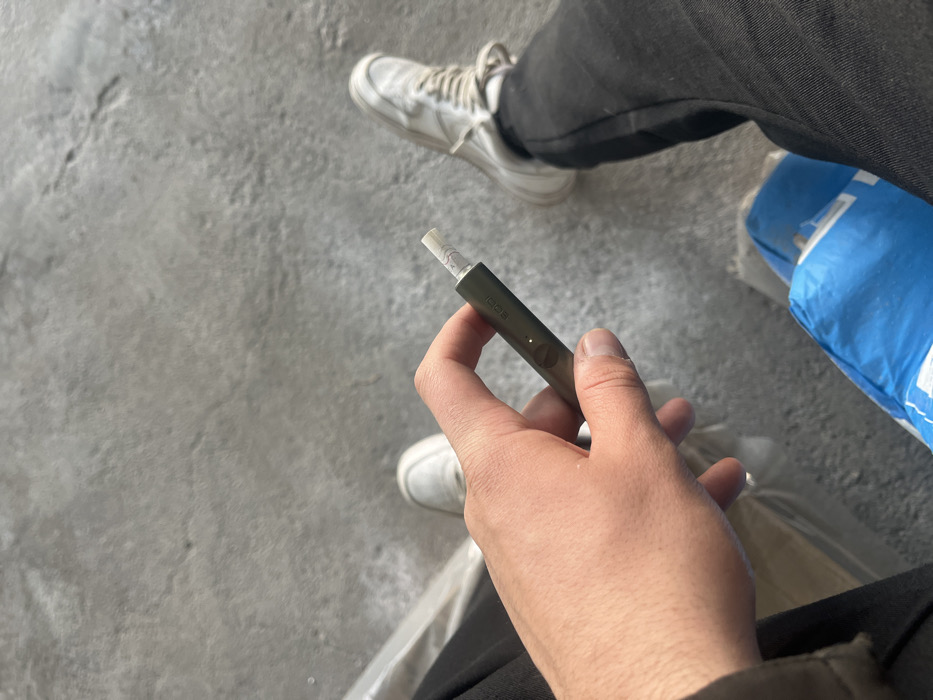 The image displays a first-person, downward-angled view of a seated individual on a concrete surface in Dupnitsa, Bulgaria. The individual's left hand, with visible knuckles, grasps a dark grey or olive-green IQOS heated tobacco device. A white heatstick with a patterned wrapper is inserted into the device, with its white filter tip exposed. The device exhibits an illuminated indicator light. The individual's legs are clad in black trousers and white athletic sneakers with light-colored soles and laces. A blue package or bag with white markings is situated on the concrete between the feet. A translucent white plastic element is partially visible on the ground to the left. The ground consists of a rough, light grey concrete surface.