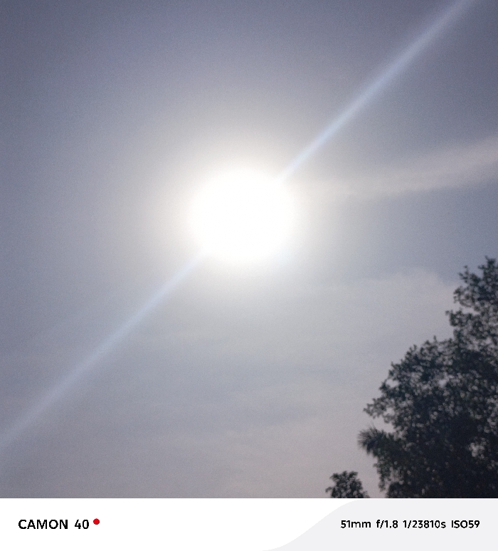 The scene depicts a hazy daytime sky over Agbani, Nigeria. The sun, a brilliant, overexposed white orb, is centrally positioned, slightly offset to the left, emitting a prominent diagonal lens flare. Dark, out-of-focus tree foliage is visible in the lower-right quadrant of the frame. No individuals, actions, or interactions are present within the depicted environment.