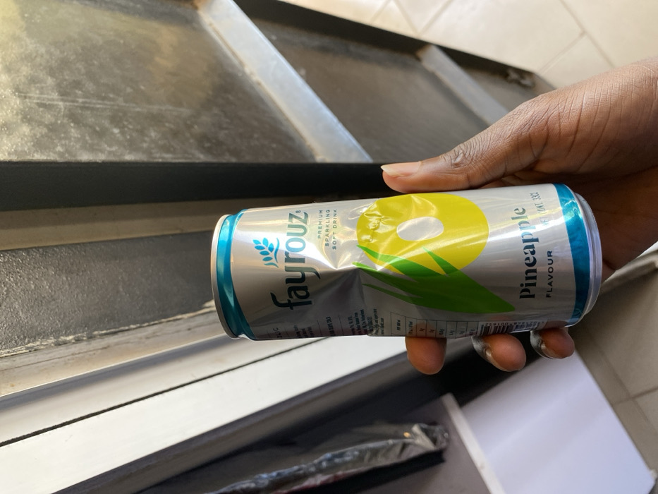 A dark-skinned right hand holds a silver Fayrouz brand premium sparkling soft drink can, pineapple flavored