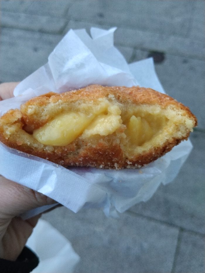 A golden-brown, fried pastry is held in a white paper wrapper, sliced open to reveal a creamy, yellow filling. The crust appears to be sprinkled with a light coating of sugar. The texture of the pastry seems crispy. The filling is thick and smooth. The background shows a blurred grey surface, presumably pavement. A portion of a hand is visible holding the treat.