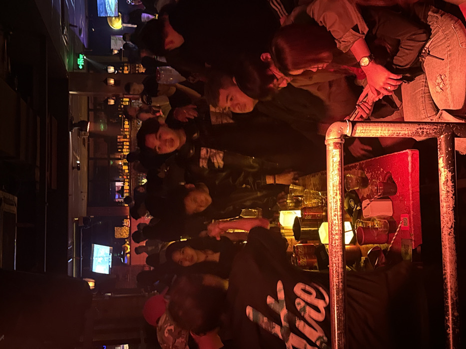 In a dimly lit bar, patrons gather around a counter cluttered with drinks and barware. A metal railing and a red-lit display of glasses partition the space. A woman in jeans and a watch peers over the railing, while others stand or lean against it. The atmosphere is lively, with faces visible among the crowd. In the background, a TV screen flickers.