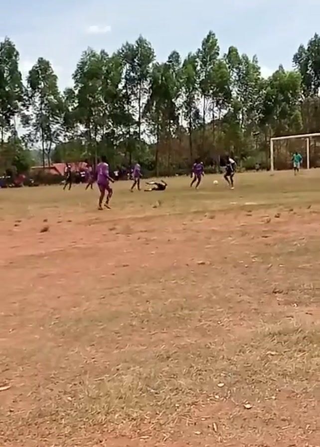soccer game on a dry, dirt field with patches of grass. Several players wearing purple jerseys are running around the field, appearing to chase a soccer ball. There is a goal at one end of the field, with a person standing in front of it. Trees are visible in the background, lining the perimeter of the field. A whistle is blown at one point, stopping the play.