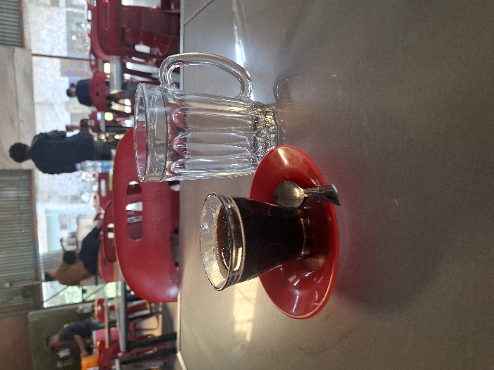 The image displays a close-up view of a grey tabletop within a casual eatery located in Lhokseumawe, Indonesia. In the foreground, a clear glass filled with dark coffee and surface foam rests on a red saucer, accompanied by a small silver spoon. Adjacent to it, a clear glass mug containing water is present. The midground and background feature multiple red plastic chairs and grey tables, some of which are occupied by patrons. Figures are largely out of focus, indicating depth. One individual wearing a dark jacket or shirt stands with their back to the camera in the central mid-background. Other blurred persons are seated at tables. The environment suggests an open-air or semi-covered establishment, evidenced by corrugated metal visible in the upper background and light-colored structures beyond the patrons. No specific actions or interactions are clearly discernible due to the shallow depth of field.