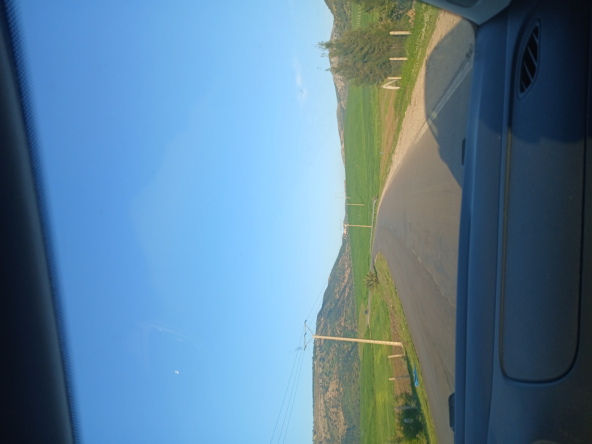 The image depicts a rural road in the vicinity of Volubilis, Morocco, viewed from inside a moving vehicle through its windshield. The lower portion of the image shows the dark dashboard and the base of the windshield, with an air vent visible on the right side of the dashboard. A large, dark shadow, likely from the vehicle or an occupant, extends onto the road from the right. A two-lane asphalt road curves through the scene, moving from the lower-left foreground towards the upper-right midground. Faded white lines mark the center of the road. Green, cultivated fields flank both sides of the road. On the left, wooden fence posts are visible. Multiple utility poles with overhead power lines extend along the left side of the road into the distance. A small, dark-colored vehicle is visible on the road in the distance, partially obscured by the curve. The background consists of rolling hills covered in a mix of green vegetation and lighter brown patches under a clear, bright blue sky. Some sparse trees or bushes are present near the road's edge on the right. Slight reflections or lens flares are visible on the windshield in the upper portion of the sky. No individuals are directly visible.