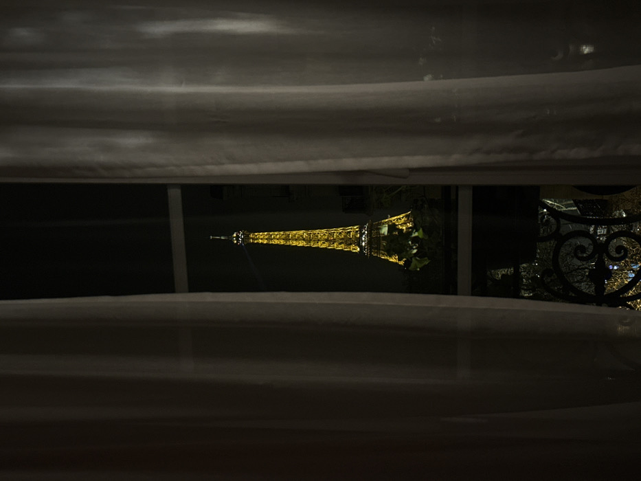 The image displays a nighttime view of the Eiffel Tower in Paris, France, observed from an interior window
