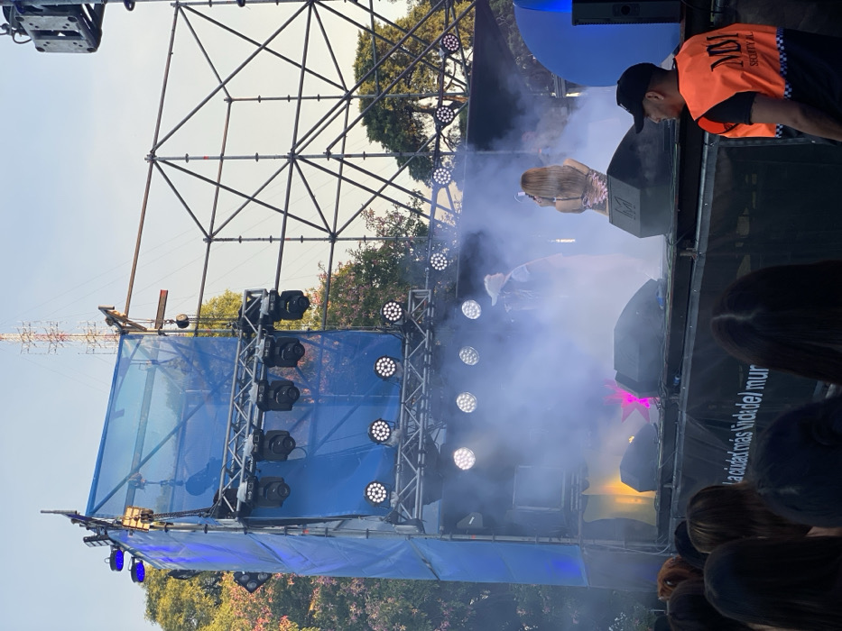A concert stage is set with a blue screen, lighting fixtures, and a metal truss structure. Two performers are partially visible amidst smoke and bright lights. A security guard wearing an orange vest is positioned to the side, monitoring the scene. The crowd is seen from behind, with various hairstyles and colors on display. The background features trees and a utility tower against a clear sky.