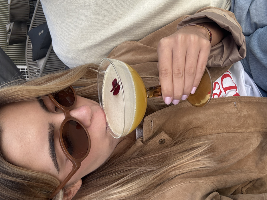 A female individual is depicted in a close-up, outdoors on what appears to be a rooftop terrace. The location is identified as the VANE Skybar, situated at the NH Collection Eindhoven Centre, Netherlands. The subject, positioned slightly left of center, has long blonde hair and is wearing brown, oval-shaped sunglasses. She is dressed in a light brown suede-like jacket over a white t-shirt with red lettering, and blue jeans are partially visible below. On her left wrist, she wears a thin beaded bracelet. Her left hand, with light pink nail polish, holds a stemmed cocktail glass containing a yellow liquid topped with white foam and garnished with two reddish-purple petals. Her head is angled downwards as she brings the glass to her lips, appearing to drink or smell the cocktail. To the right, a second individual is partially visible, identifiable by a light-colored, possibly beige or off-white, knitted garment. The background reveals upscale outdoor lounge furniture with dark cushions and greyish, vertically slatted woven backs, characteristic of a modern rooftop bar setting. A dark canopy or umbrella is partially visible at the top edge of the frame.