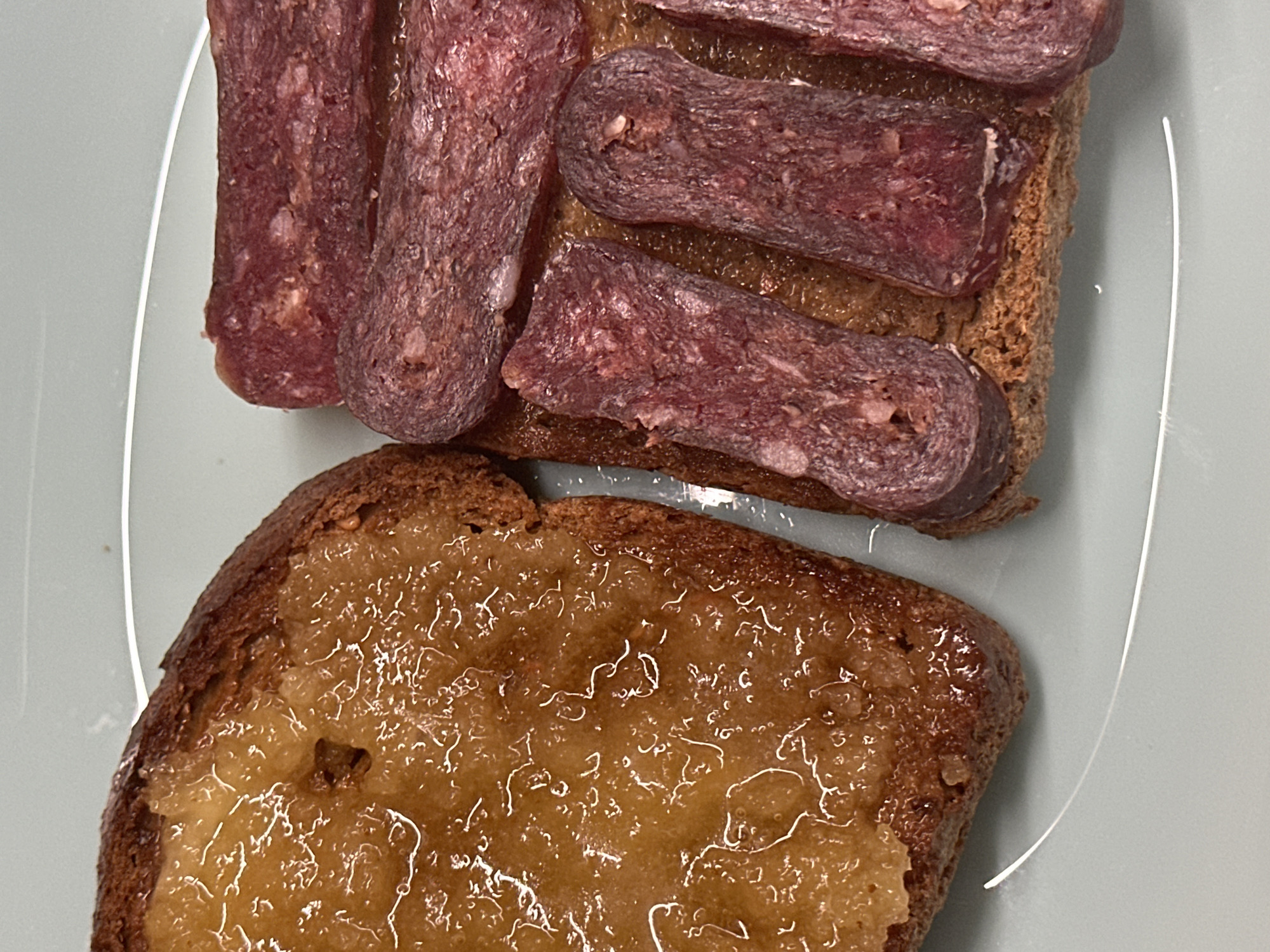 two slices of brown bread on a pale blue plate. One slice is topped with several pieces of dark red sausage. The other slice is covered with a translucent, golden-brown spread, possibly jam. The image does not provide any information regarding location in Sofia, Bulgaria or include any people or actions.