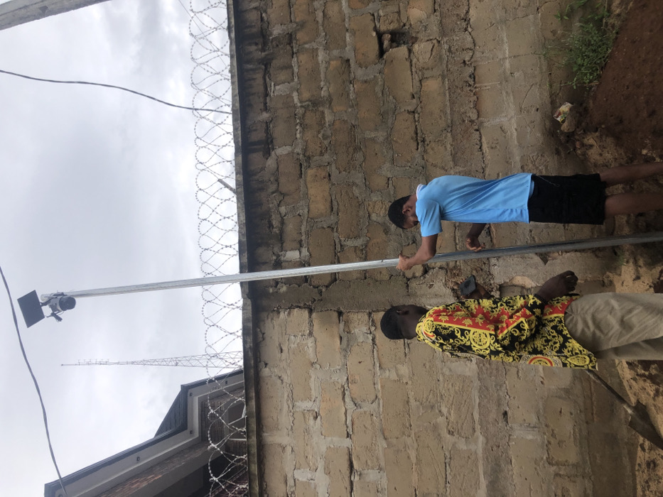 two males installing a tall, galvanized metallic pole topped with a dome-shaped CCTV camera and a square solar panel in Onitsha, Nigeria