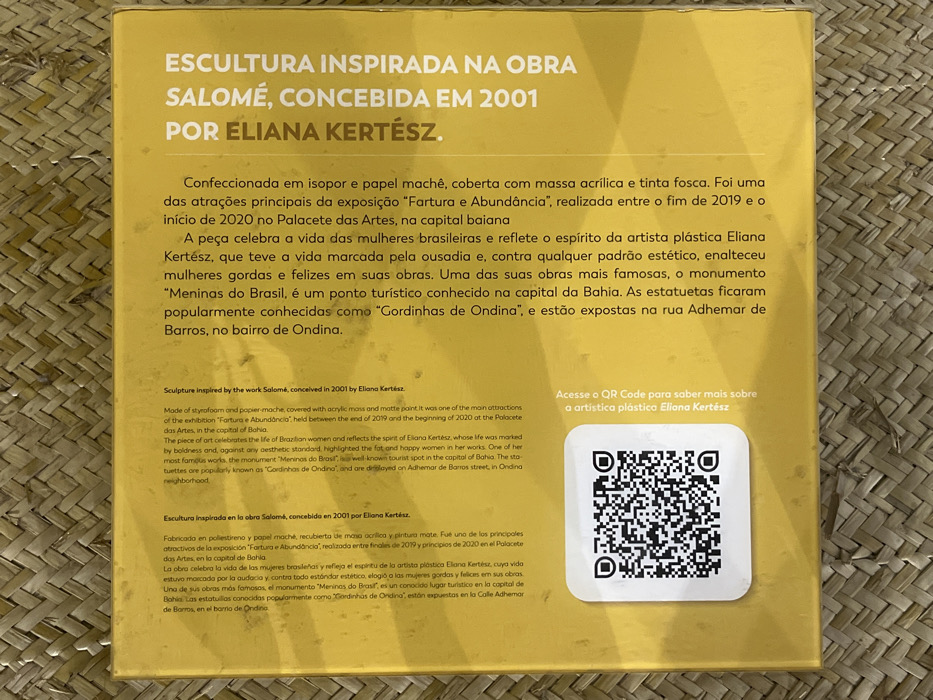 The image displays an overhead view of a yellow, rectangular object, likely a book cover or box, resting on a light brown, woven surface. The object's visible face is yellow, predominantly covered with black text in Portuguese, with some sections translated into English and Spanish. A white square sticker containing a black QR code is affixed to the lower-left portion of the yellow surface. The primary text, oriented vertically along the right edge, reads "ESCULTURA INSPIRADA NA OBRA SALOMÉ, CONCEBIDA EM 2001 POR ELIANA KERTÉSZ." Further text details an exhibition titled "Fartura e Abundância," which took place at the Palacete das Artes in Salvador, Bahia, Brazil. It references the artist Eliana Kertész's work, including sculptures known as "Meninas do Brasil" and "Cordinhas de Ondina." The description explicitly states that the "Cordinhas de Ondina" sculptures are exhibited on Rua Adhemar de Barros, located in the Ondina neighborhood of Salvador, Bahia, Brazil. Adjacent to the QR code, text in Portuguese instructs the viewer to "Acesse o QR Code para saber mais sobre a artista plástica Eliana Kertész" (Access the QR Code to learn more about the plastic artist Eliana Kertész). The background consists of a tightly woven material, likely straw or wicker, displaying a diagonal pattern. There are no individuals or discernible actions depicted in the scene.