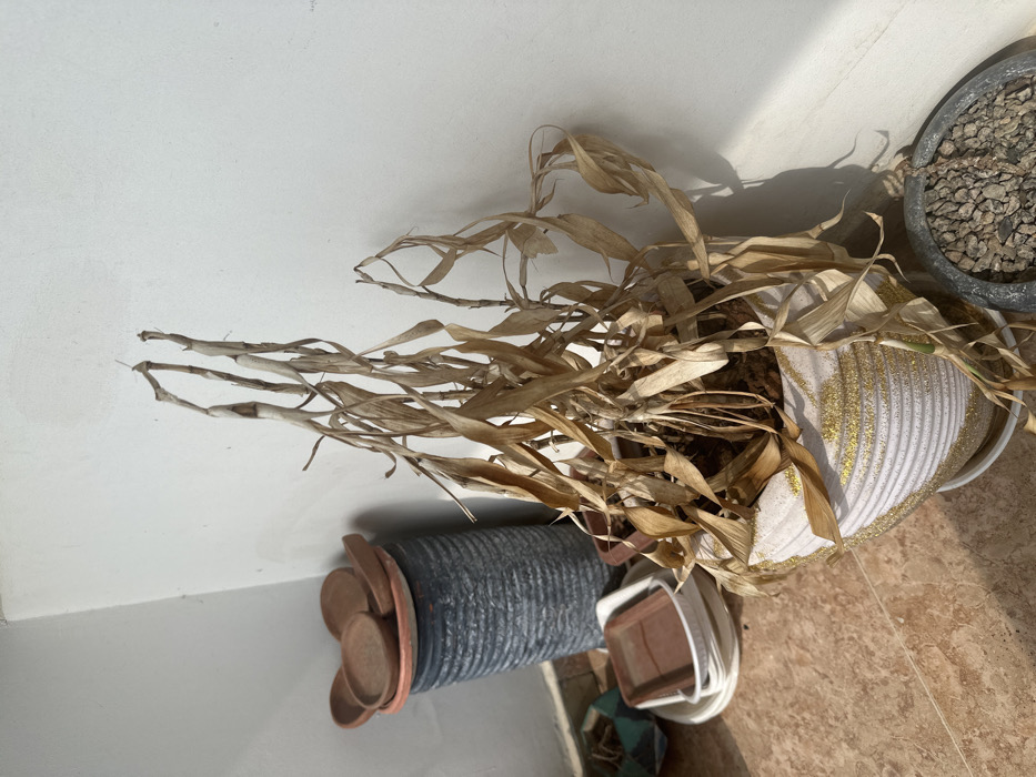 This image captures an outdoor corner in Abuja, Nigeria, featuring a collection of plants and gardening items under direct sunlight. The primary subject is a large, dead or severely dehydrated plant with entirely brown, shriveled leaves and stems, housed in a white ceramic pot with gold glitter stripes. This pot rests on a white saucer on a light brown tiled floor. To the left of the central plant, against a light-colored wall, stands a tall, cylindrical, dark grey textured container. Stacked atop this container are multiple small, round, terracotta-colored plant saucers. Below, on the tiled floor, several white plant trays/saucers are visible, some stacked, one containing reddish-brown soil. A green and black patterned container is also present in this area. To the immediate right of the main plant, a smaller, dark grey pot filled with light-colored gravel is partially visible. The light-colored walls form a distinct corner, and sharp shadows are cast across the scene, indicating bright outdoor illumination. No individuals are present.