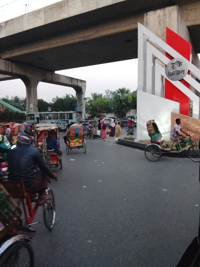 A bustling street scene unfolds under a concrete overpass. Colorful rickshaws dominate the foreground, weaving through the traffic. A bus can be seen further down the road. Pedestrians, some in traditional dress, are crossing near a monument featuring red and white accents and what appear to be Bengali characters. The sky is overcast, contributing to the somewhat muted lighting of the urban environment.