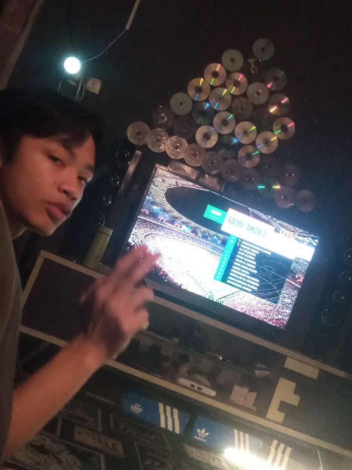 This image depicts an interior residential scene in Ciherang, Indonesia. A young East Asian male is visible in the left foreground, positioned from the chest up, looking directly at the camera with a neutral expression. His right hand is raised, displaying the index and middle fingers in a V-shape. A flat-screen television is centrally located, displaying a brightly lit stadium full of spectators. On the screen, an overlay shows "SAUDI ARABIA" and a partial list of names, indicative of a sports broadcast or video game. The television is flanked by two dark audio speakers. Above and to the right of the television, a collection of approximately 30-40 compact discs are affixed to a dark wall, arranged in a rough triangular pattern, reflecting various colors. A single, bright circular light source is mounted on the upper left wall. Below the television, a multi-tiered shelving unit contains several objects, including a white electronic device on an upper shelf and two blue "adidas" branded shoe boxes and one "new balance" branded shoe box on a lower shelf. The floor or rug in the foreground is patterned. The overall environment is dimly lit.