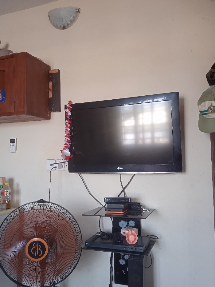 The image displays an interior room located in Lagos, Nigeria. A light-colored wall features a black LG flat-screen television mounted centrally, reflecting ambient light from an unseen window. A string of small red and white decorative ornaments hangs vertically along the left edge of the television. Below the television, a black, multi-tiered entertainment stand with at least two glass shelves holds various electronic devices. The top shelf supports a stack of components, including what appears to be set-top boxes or media players, along with their associated black cables. The lower shelf contains another electronic device, a remote control, and a small pink/orange personal fan. Numerous black wires connect the television and devices to a white wall outlet positioned to the left of the TV. A small white wall-mounted device, possibly a remote holder or thermostat, is visible further left. In the upper-left quadrant, a dark brown wooden wall cabinet with two doors is partially visible, containing a small framed picture. In the lower-left foreground, a large, dark-colored standing fan with a circular cage and an orange "BB" logo on its central hub is present. A clear plastic bottle with a yellow cap and white label is partially visible behind the fan. A frosted glass wall sconce is affixed high on the left wall. On the far right, a khaki-colored cap with a green and white striped band and an emblem is hung. The scene contains no visible people.
