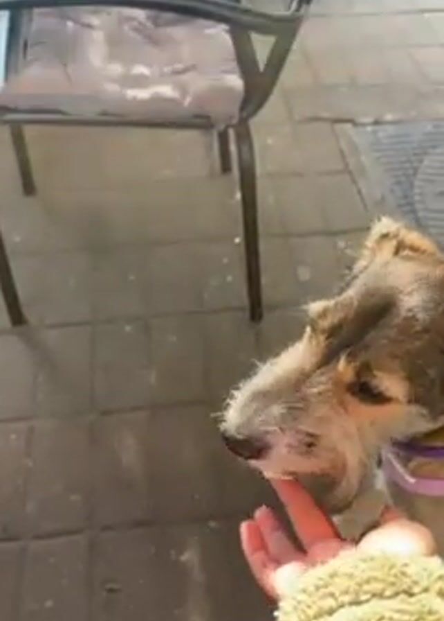 A dog is being hand-fed a piece of something white